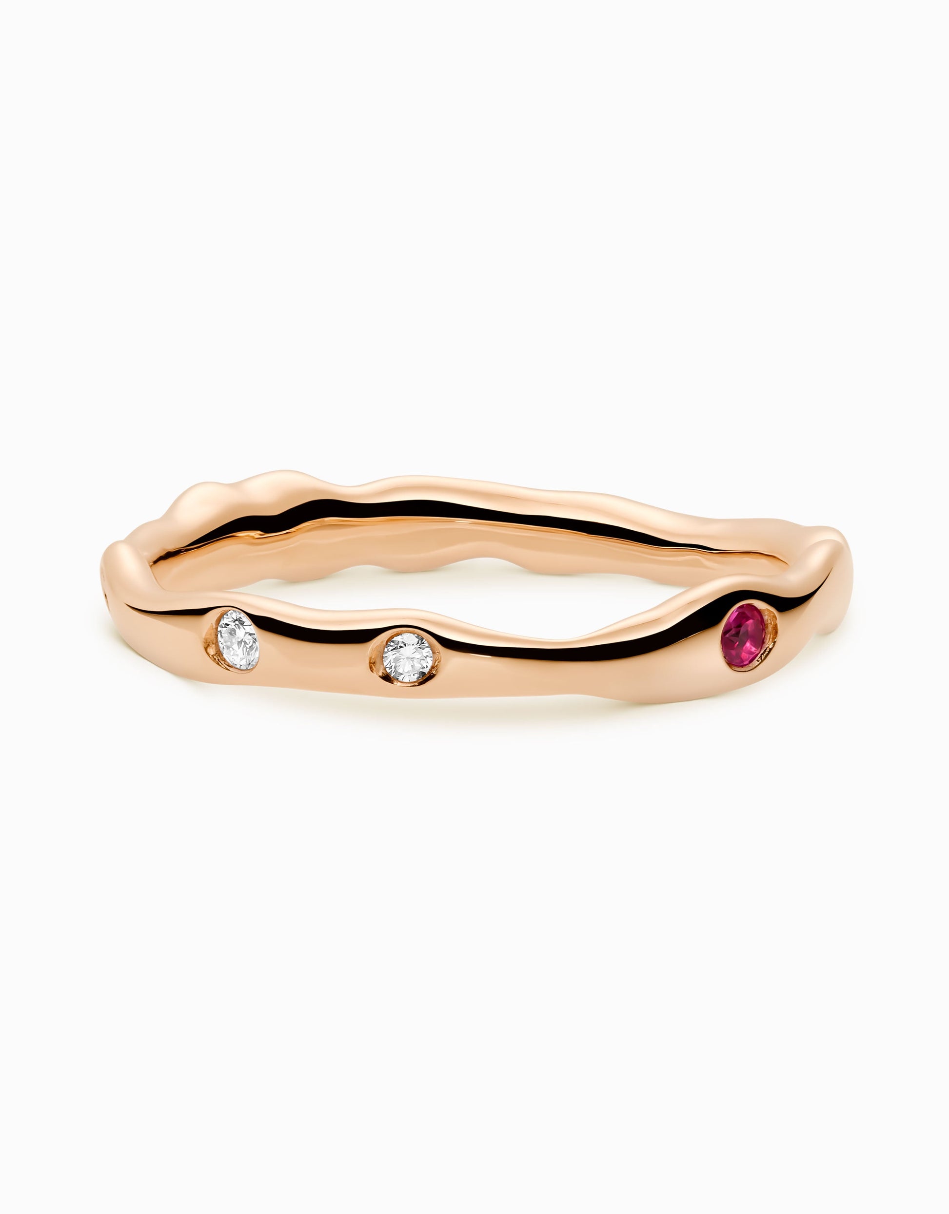 Aquesta aliança llueix amb 7 diamants de triple excel·lència que li regalen petits tocs de llum, i també amb una petita pedra preciosa de color que acaba de donar-li el toc fresc i vital. Aquesta gemma es pot personalitzar al teu gust. Tria la que tingui el teu color preferit o la que correspongui amb la teva pedra natal d'entre les següents: robí, maragda, safir rosa, safir taronja, safir verd, safir blau, diamant o aiguamarina. També pots escollir acabat mate o brillant.