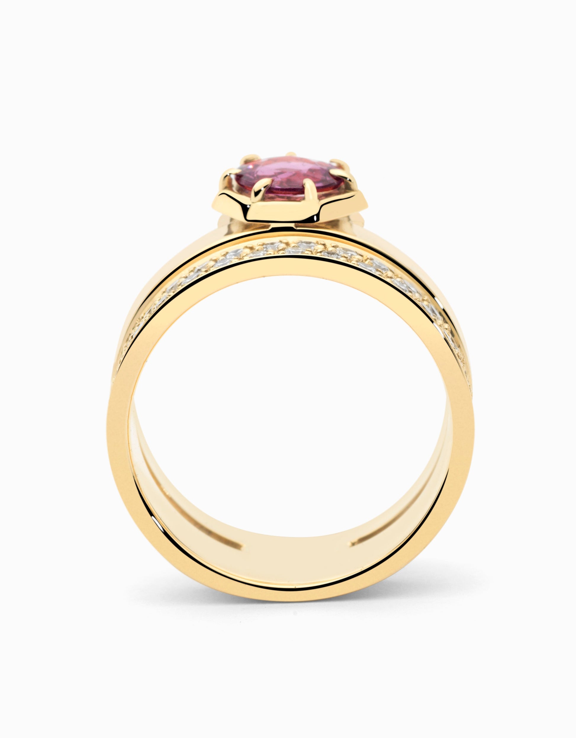 Jordi Rosich, joier i dissenyador de Roosik & Co, ha creat aquest anell d'or groc coronat per un safir rosa natural de 0,58ct d'increïble bellesa. La gemma està subjectada per una montura creada a mida de la talla d'aquest safir, per això mai trobaràs dues joies de la col·lecció "Unrepeatable" de Roosik Gallery iguals. La part inferior és gairebé tan espectacular com la superior gràcies als diamants naturals de triple excel·lència que ressegueixen l'anell en una doble aliança i que aconsegueixen fer brillar la joia tot aportant-li el toc adequat de sofisticació i exclusivitat. Aquest anell d'or groc i diamants és una de les peces reines de la nostra Col·lecció.