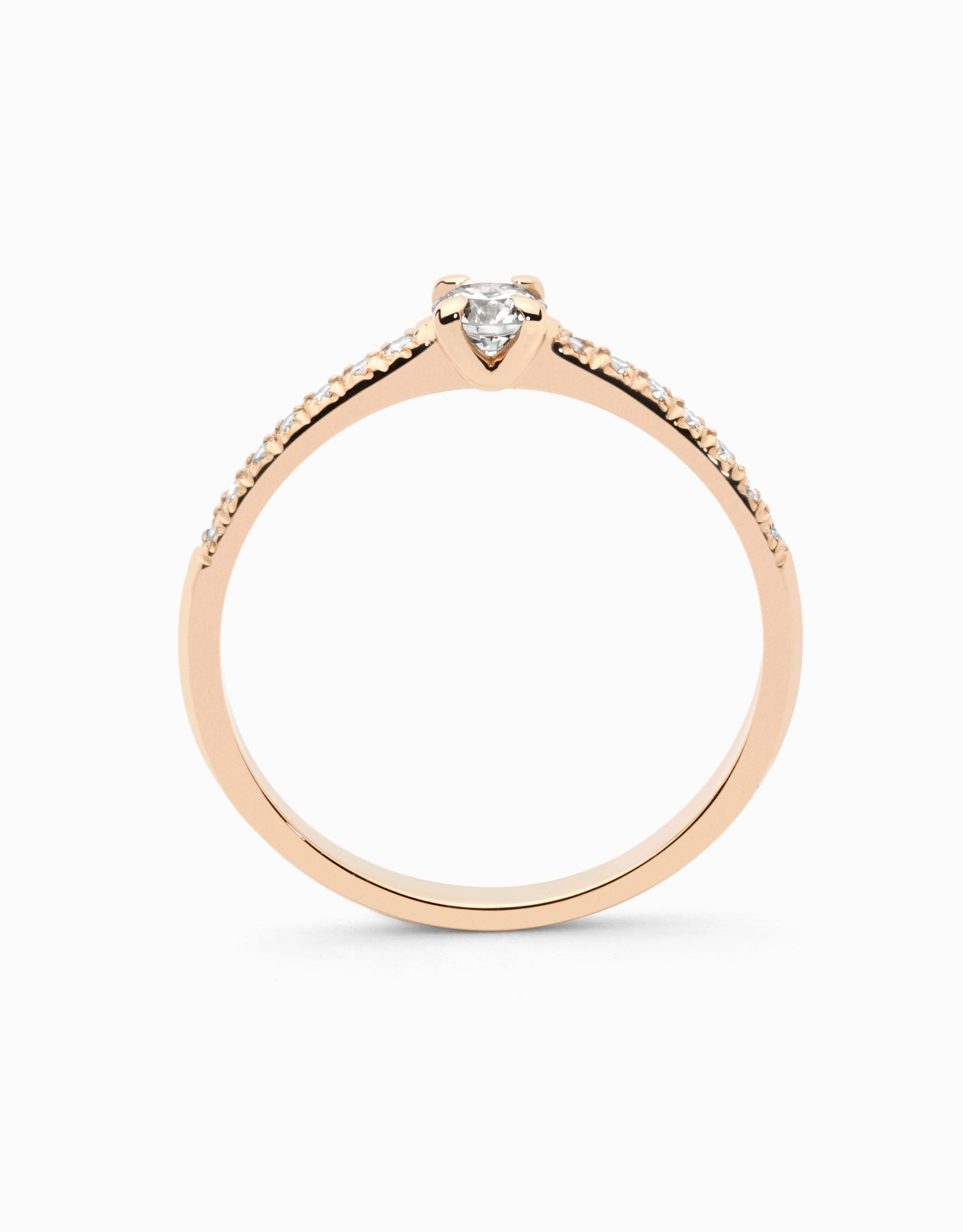 En aquest anell de compromís, Jordi Rosich cerca el minimalisme absolut de les línies i alhora juga amb la lluminositat de la peça, gràcies al diamant central de 0,15 quirats i a la successió de diamants naturals a banda i banda. La blancor dels diamants s’integra a la perfecció amb l'anell d'or rosa i en resulta una combinació dolça, elegant i original. Un anell de tarannà clàssic i atemporal però alhora fresc i portable. Ideal per a aquella noia somiadora, sentimental i creativa. També es treballa en or blanc i or groc.