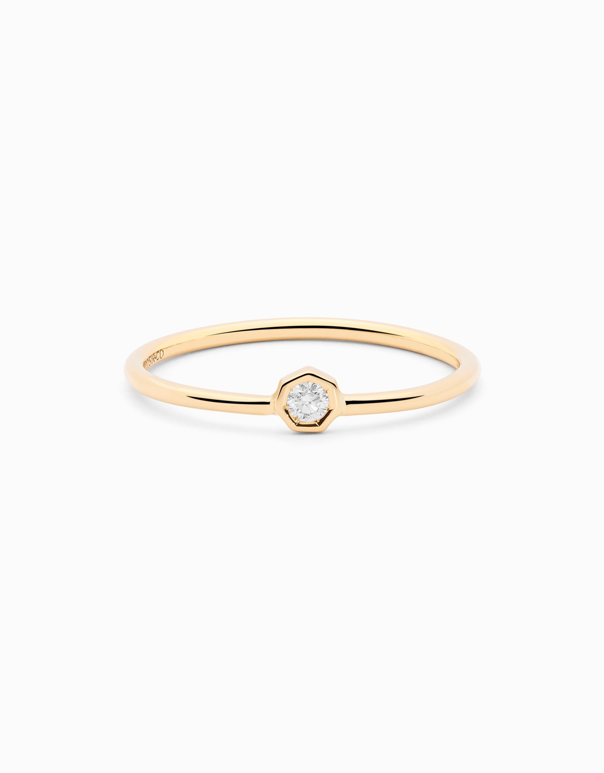 Aquest anell d’or amb diamant té un aire minimalista i delicat especialment pensat per a donar molt de joc. La subtilesa d’aquesta joia tan portable aportarà un toc de lluminositat a qualsevol look. Al mateix temps, la seva forma i acabat és perfecte per a combinar-se amb altres anells de la mateixa sèrie amb diferents gemmes de colors: robí, maragda, aiguamarina safir rosa, safir groc i safir blau.